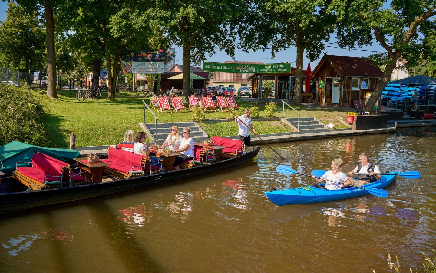 Direkt am Bootshaus befindet sich ein gemütlicher Biergarten mit Holzbackofen und Räucherecke. Spreewaldtypische Gerichte, deftige Haxe, saftiger Backschinken und frisch geräucherter Fisch werden in den Öfen zubereitet.